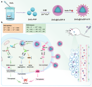本项研究开发了一种工程掺杂策略,用Cu2+掺杂的ZIF-8框架包裹ZnO2纳米球,并在其表面修饰转铁蛋白(Tf),得到ZnO2@Cu/ZIF-8-Tf纳米系统。Tf与其受体的特异性结合实现了纳米系统在肝癌细胞的靶向高效聚集。在肿瘤微环境中,纳米系统释放的Cu2+/Fe3+消耗谷胱甘肽(GSH)被还原,破坏抗氧化防御机制并伴随着Cu+/Fe2+的产生。Cu+的异常聚集干扰了细胞三羧酸循环,导致二氢硫辛酰胺S-乙酰转移酶(DLAT)的寡聚化和铁硫簇蛋白的丢失,以激活铜死亡而导致细胞死亡。而Fe2+的产生导致铁过载以及ZnO2自体供应的H2O2介导活性氧(ROS)过量产生以诱导增强铁死亡效应。在机制上,GSH的消耗导致GPX4失活,抑制了the system Xc--GSH-GPX4信号通路,而大量ROS的产生触发了脂质过氧化以引起脂质代谢重编程,最终导致细胞抗氧化系统和膜修复系统双双失灵。这项研究为通过靶向级联增强铁死亡/铜死亡应用于肝癌多模式协同治疗提供了新的参考。