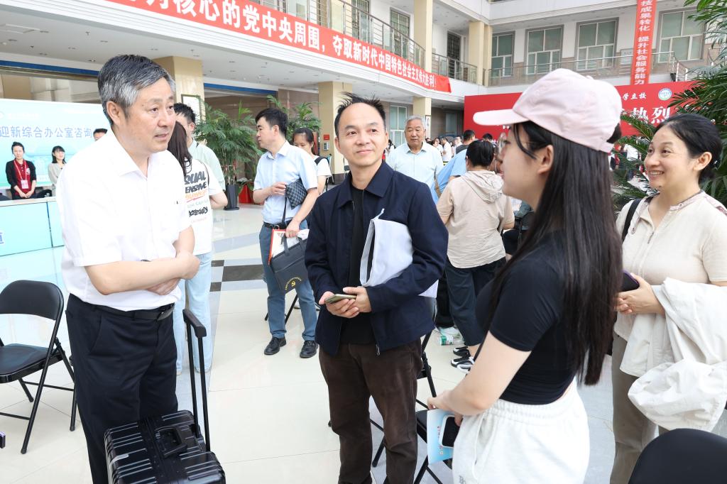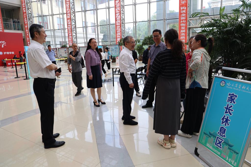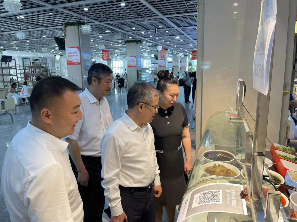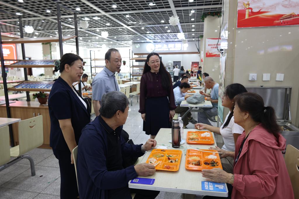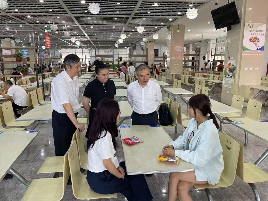 学校领导深入食堂实地察看餐饮质量、就餐环境等情况,与报到的新生和家长亲切交流,倾听意见建议。