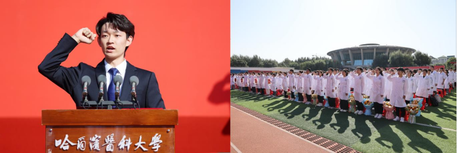 基础医学院2023级临床医学(“5+3”一体化)专业本科生杨雨凡同学领誓。生命所系、性命相托,声声誓言,坚定有力,震撼全场。正值华茂的青年医学学子们郑重的踏上探索生命、救疾治病的医学之路。