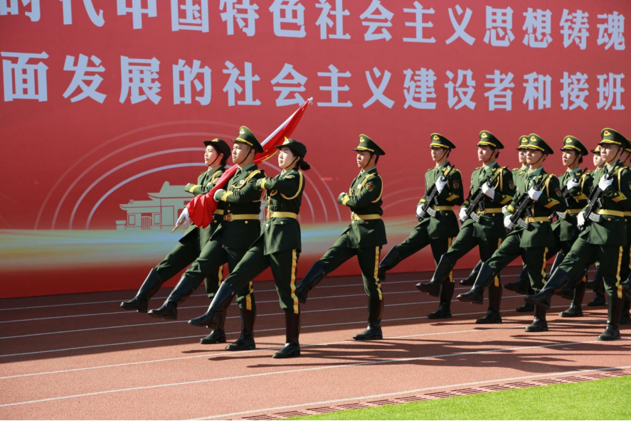 9时整,雄浑的国歌声响起,全场师生高唱国歌。
