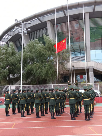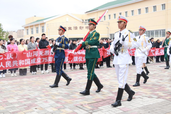 国旗护卫队迎着朝阳,迈着铿锵有力的步伐走向升旗台;庄严的国歌声响彻整个校园,鲜艳的五星红旗迎风飘扬,冉冉升起,全体观礼人员肃然而立,满心皆怀爱国情,共祝伟大祖国巍巍山河永昌、国家繁荣富强。