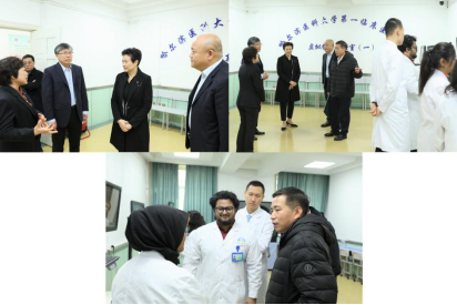 随后,调研专家组走访了附属一院,实地参观临床实验教学中心,观摩了虚拟仿真实验教学和临床情景模拟教学,并与留学生进行交流。附属一院党委书记李悦等院领导全程陪同参观。