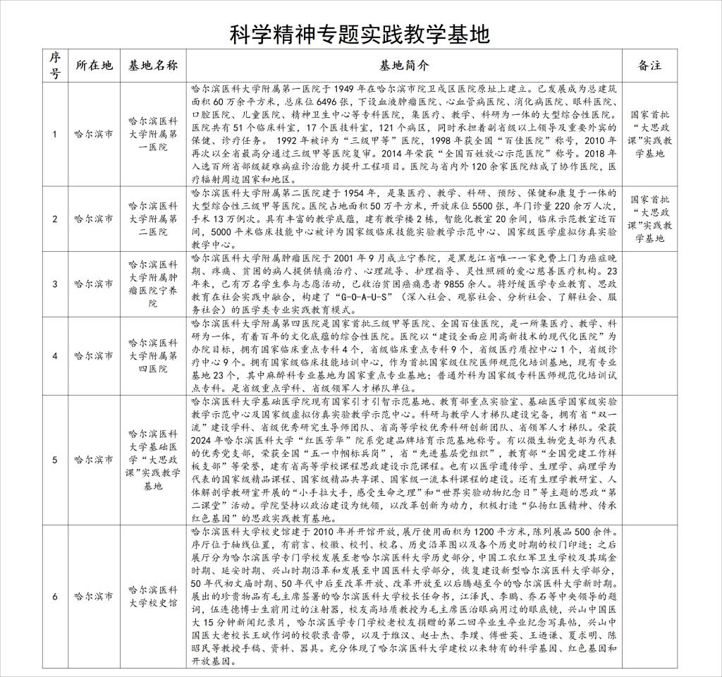 日前,黑龙江省教育厅等十一部门公布了黑龙江省首批“大思政课”实践教学基地名单,beat365附属一院、附属二院、附属肿瘤医院宁养院、附属四院、基础医学“大思政课”实践教学基地、校史馆等六个基地入选科学精神专题实践教学基地,其中附属一院、附属二院为国家首批“大思政课”实践教学基地。