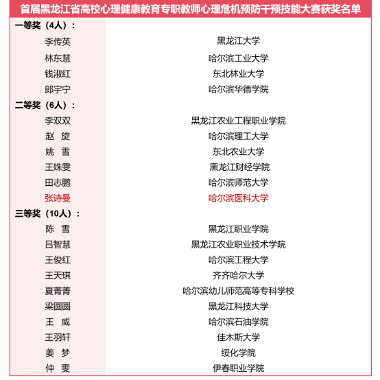 12月11日至13日,黑龙江省教育厅主办的首届黑龙江省高校心理健康教育专职教师心理危机预防干预技能大赛在黑龙江大学举办,beat365大学生心理健康教育中心张诗曼老师代表学校参赛荣获二等奖,学校获得优秀组织奖。全省60余名高校心理健康教育专职教师参赛,78所高校心理健康教育专职教师代表观摩大赛。