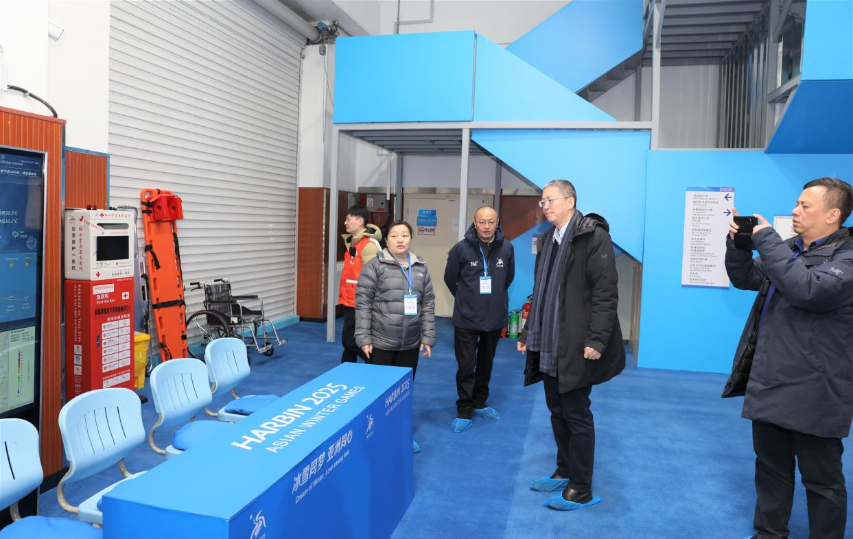 孙备院长先后来到冰球馆、综合馆、速滑馆、冰壶馆、开闭幕式场馆和冰上项目运动员村诊所,检查医疗物资、人员配备、药物管理、诊疗流程、患者转运、应急演练等工作。孙备院长指出,大家要强化大局意识、担当意识,坚持以运动员为中心,服务赛事需要,选配思想好、技术好、态度好、外语好、形象好的“五好”医生,持续提升应急反应速度和综合救治能力,为亚冬会的成功举办提供医疗保障。