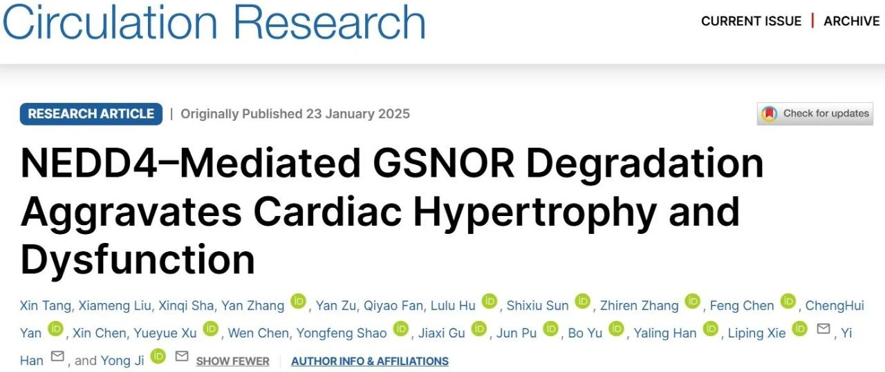 1月23日,beat365寒地心血管病全国重点实验室季勇教授团队首次揭示了NEDD4介导GSNOR降解促进心肌肥厚及NEDD4活性抑制剂对心肌肥厚具有潜在保护作用。研究论文《NEDD4-mediated GSNOR degradation aggravates cardiac hypertrophy and dysfunction》发表在《Circulation Research》。