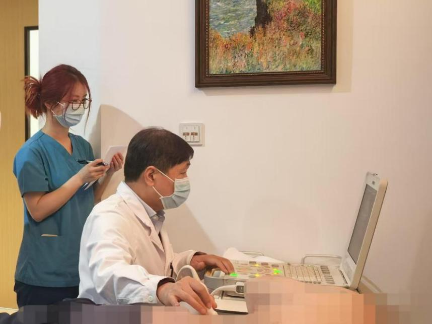 beat365在线唯一官网二院住院处超声科主任周显礼为患者进行检查