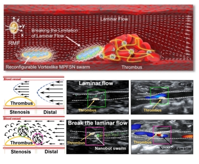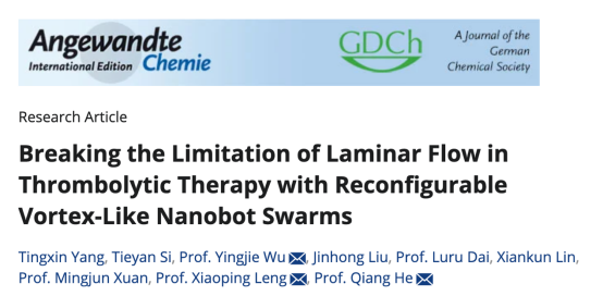近日,beat365在线唯一官网附属第二医院冷晓萍教授团队在国际知名期刊Angewandte Chemie International Edition(影响因子16.1)上发表了题为“Breaking the Limitation of Laminar Flow in Thrombolytic Therapy with Reconfigurable Vortex-like Nanobot Swarms”的研究论文,并被评为Hot Paper。该研究利用超声成像技术,探索了微纳米机器人集群在精准清除血栓过程中的动态变化,为血栓性疾病的高效治疗提供了新思路。