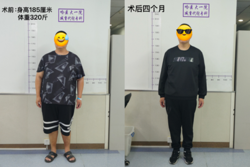 320斤的王先生(BMI 49→32),术前因肥胖并发高血压(180/110mmHg)、糖尿病(空腹血糖12.6mmol/L),术后4个月减重100斤,血压稳定在120/80mmHg,血糖恢复正常(5.8mmol/L)。他的妻子195斤李女士(BMI 36.2→28.5)因为肥胖合并胆囊结石、多囊卵巢综合征,通过减重手术联合胆囊切除术,术后22天成功减了26斤,3个月减重58斤,月经周期恢复正常,B超显示卵巢多囊样改变消失。