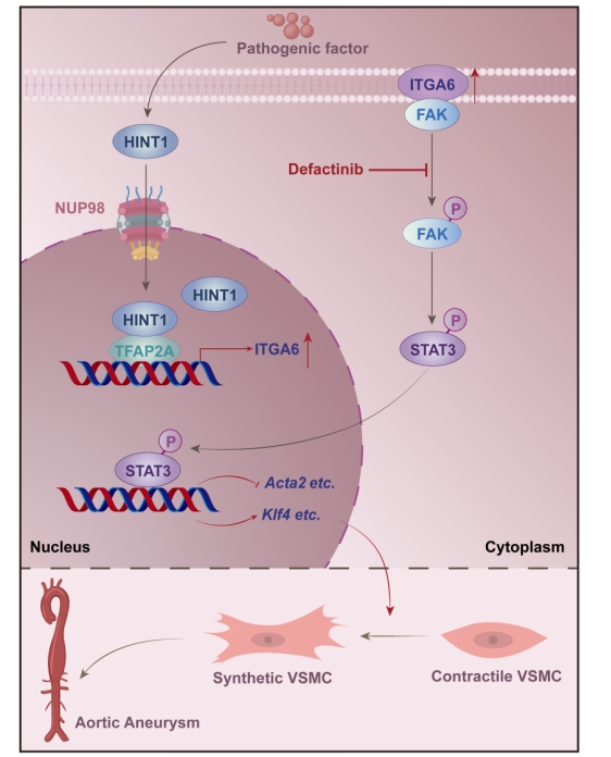 该研究通过多维度研究体系(临床样本分析、动物模型和细胞分子实验),系统阐明了HINT1在调控血管平滑肌细胞表型转化及主动脉瘤发展中的关键作用及其分子机制。研究首次揭示:在病理刺激下,HINT1通过增强与转录因子TFAP2A的相互作用,显著上调ITGA6的转录水平及其蛋白表达,进而激活FAK/STAT3信号转导通路,驱动血管平滑肌细胞表型转化和主动脉瘤进展。值得关注的是,研究发现FAK特异性抑制剂地法替尼(Defactinib)能有效阻断这一信号轴,为主动脉瘤的临床治疗提供了具有转化医学价值的新策略。该研究不仅揭示了血管平滑肌细胞表型转化的新调控机制,更为主动脉瘤的精准防治提供了创新的分子靶点和治疗思路。