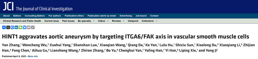 研究论文“HINT1 Aggravates Aortic Aneurysm by Targeting ITGA6/FAK Axis in Vascular Smooth Muscle Cells”在线发表在The Journal of Clinical Investigation杂志上。